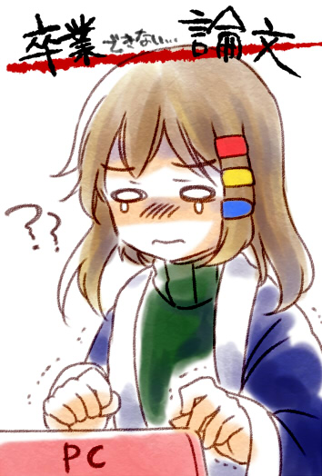 さらに卒論提出を間近に(あと5日くらいですね)控えて書き進める気が起こらず留年の危機です。でも当然ながら、留年したら学費はバイトで賄いなさいということで出さないわけにもいきません…。このブログを更新したらなんとかやってみようと思いますが、しんどいですー。